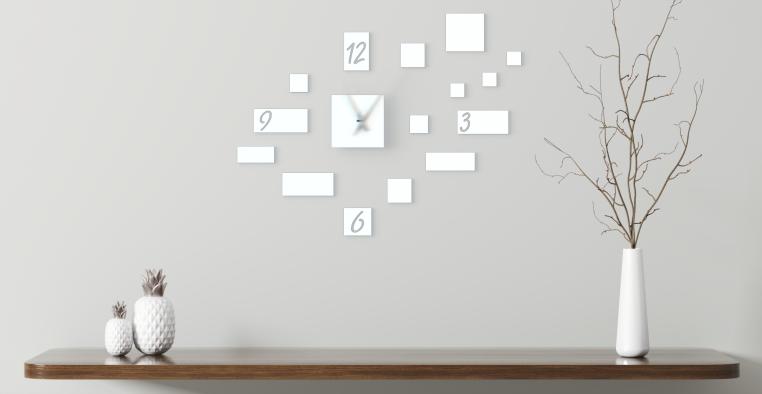 Notre astuce : Si vous souhaitez déplacer plus facilement votre horloge, vous pouvez retirer l'adhésif et fixer les éléments avec de la patafix blanche. Les pièces tiendront très bien et se déplaceront facilement sans laisser de traces.